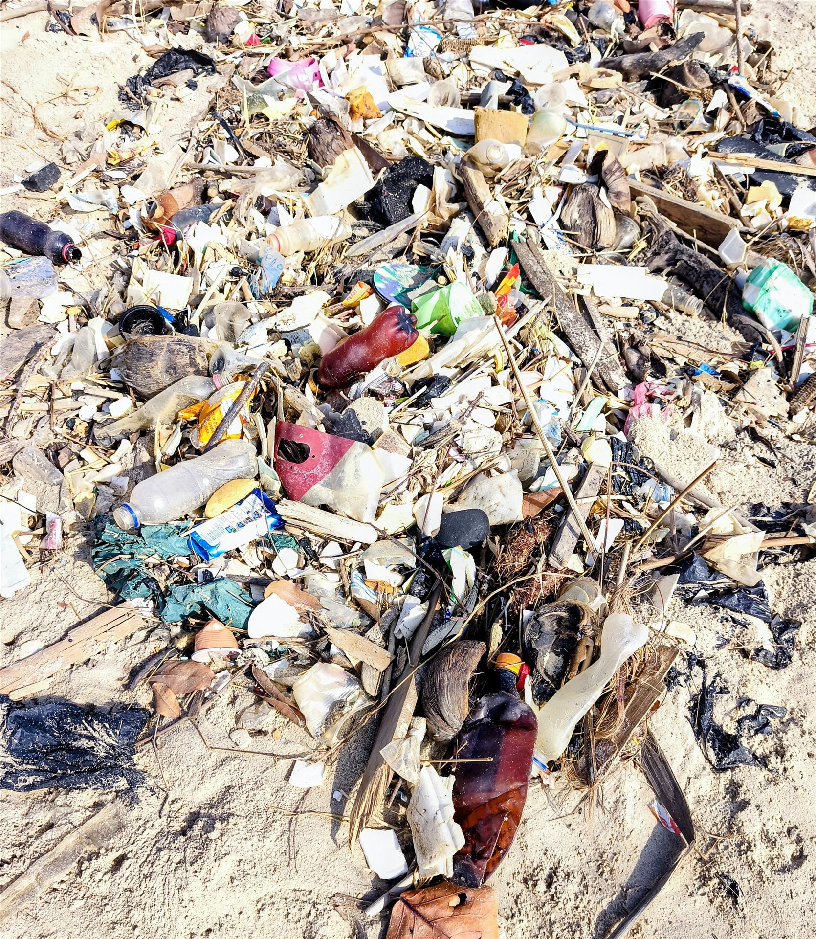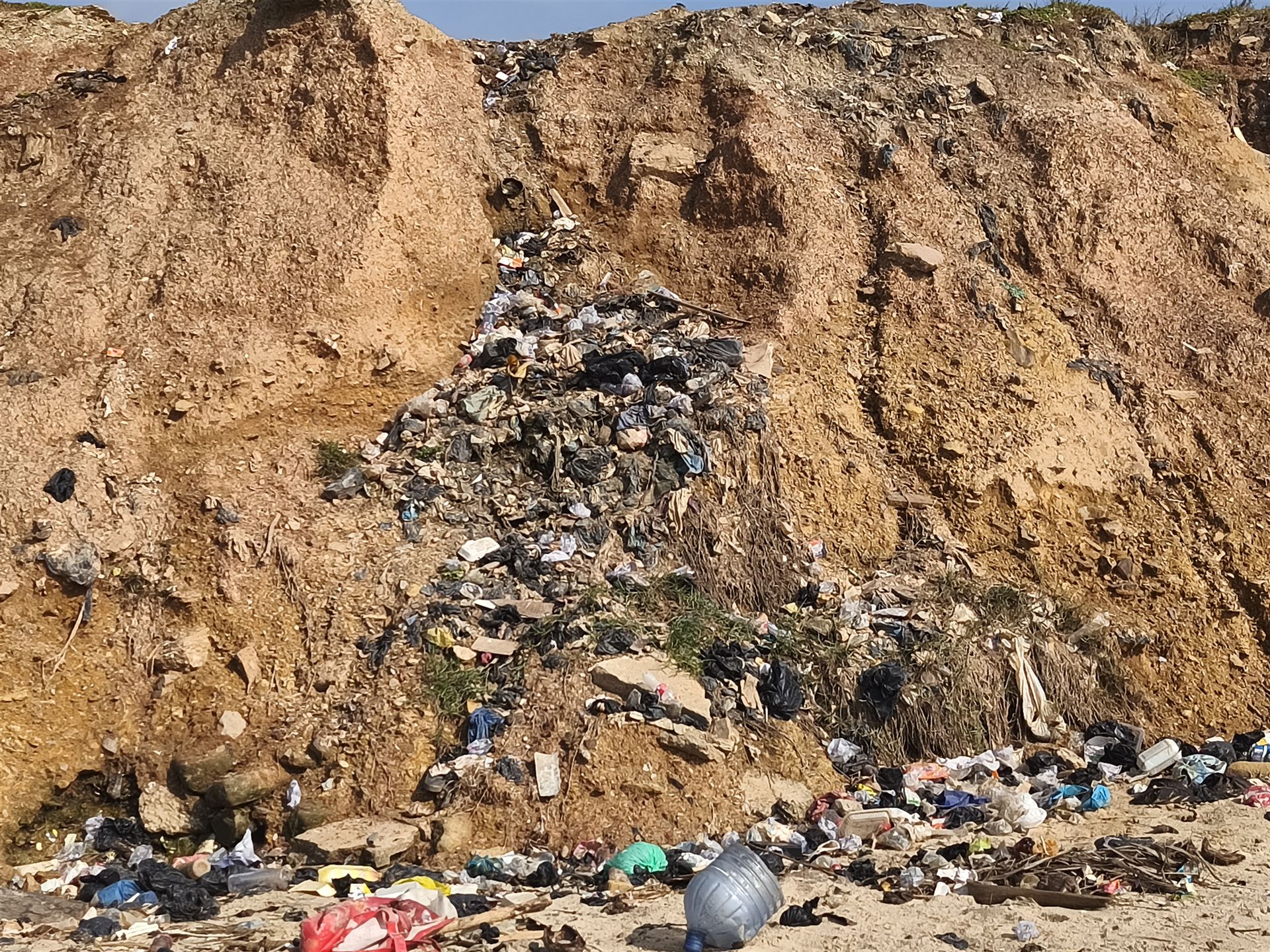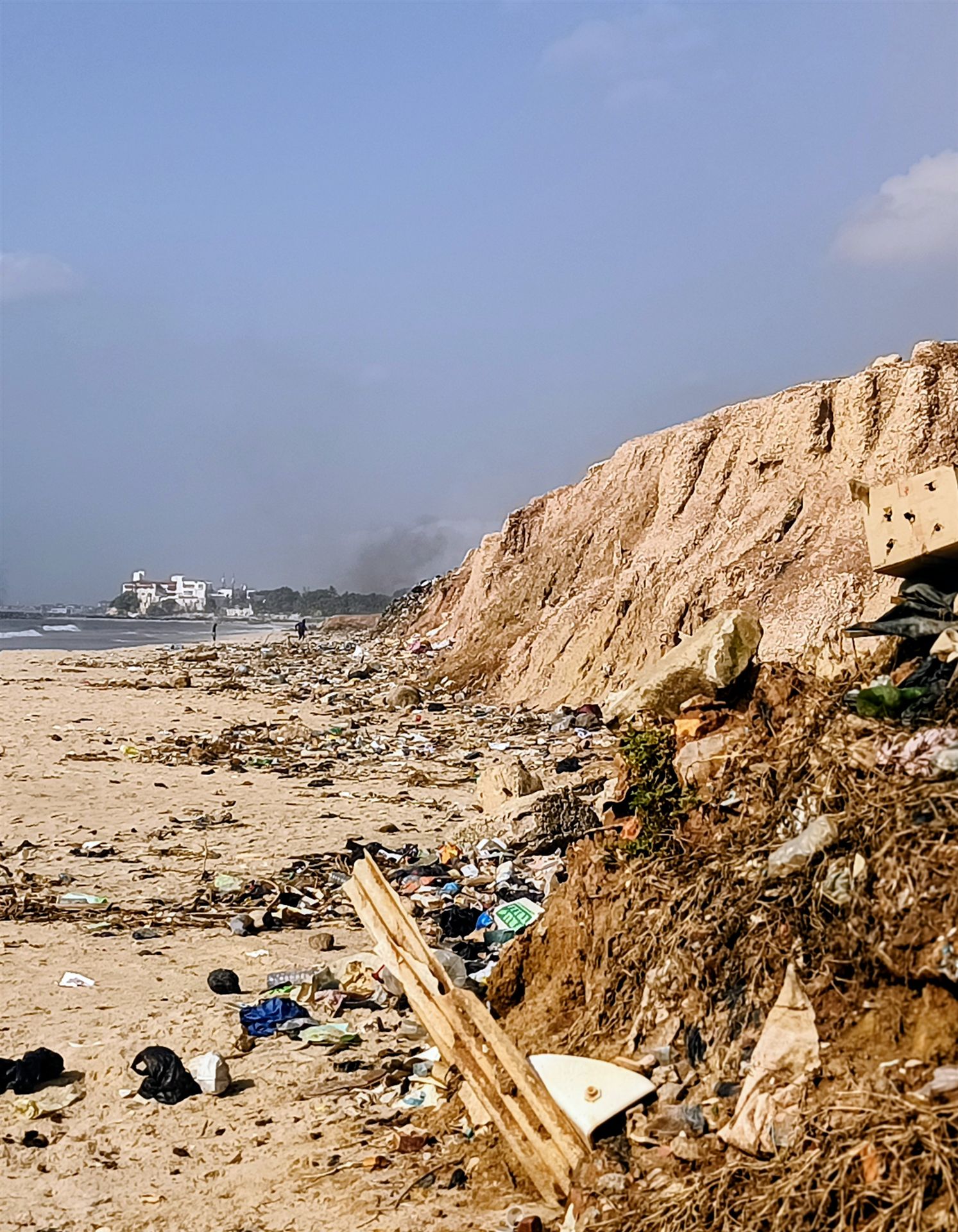 Schon der Blick von oben über die kleine Klippe hatte uns gewarnt: Der Strand sah schmutzig aus, übersät mit dem Zivilisationsmüll, den das Meer anspült. Aber wir wollten uns die Beine vertreten und stiegen hinab.