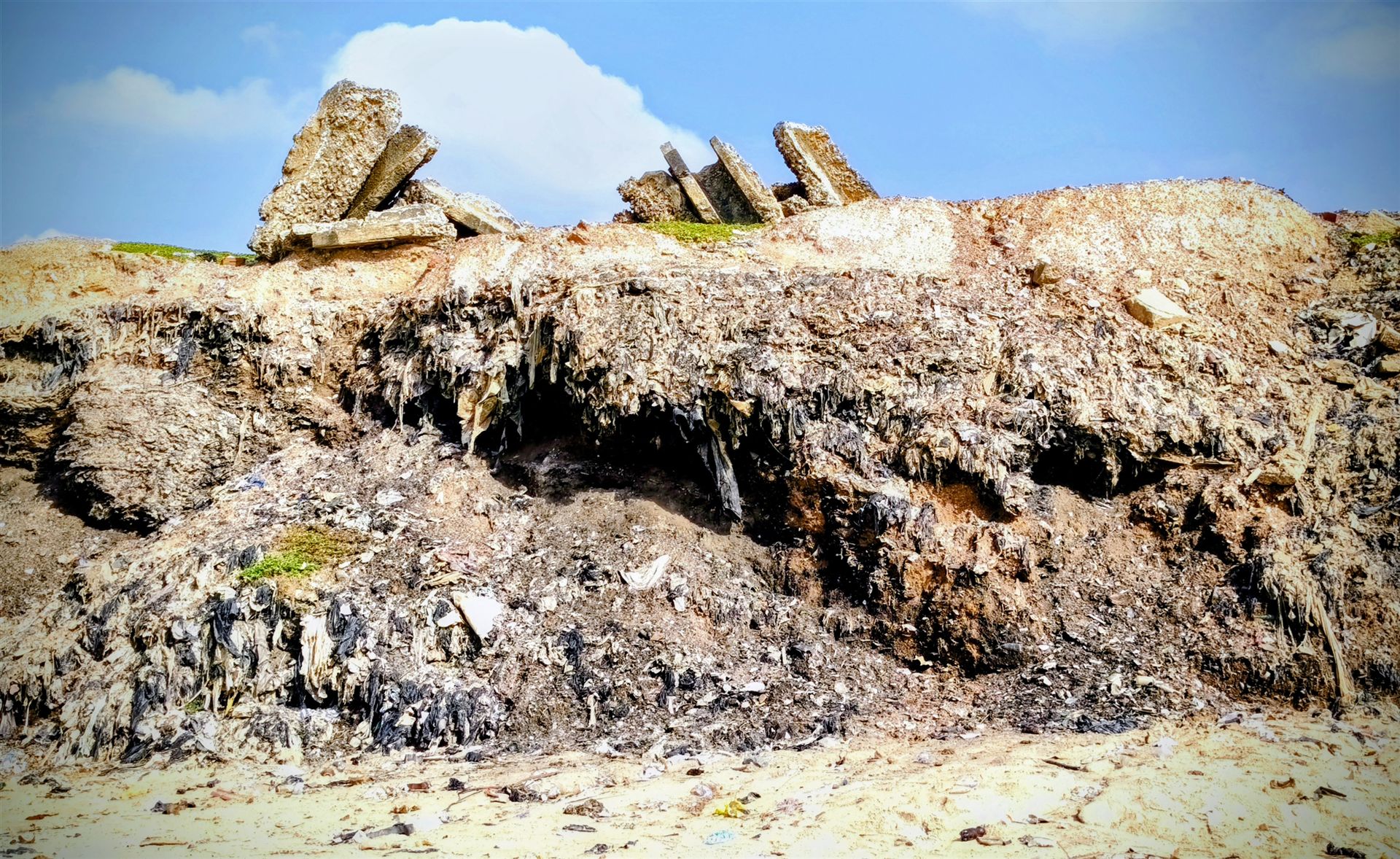 Es waren Tausende, vielleicht Millionen von Kleidungsstücken, die hier unter der Erde zu einer festen Substanz verschmolzen waren. Aus der vom Meer unterspülten Wand hingen sie heraus wie die Wurzeln toter Bäume oder wie graue, schlaffe Tentakel: Ärmel von verwaschenen Hemden, Hosenbeine von Jeans, deren Blau längst vom Salzwasser gefressen war, Fetzen von synthetischen Stoffen, die sich niemals zersetzen werden.