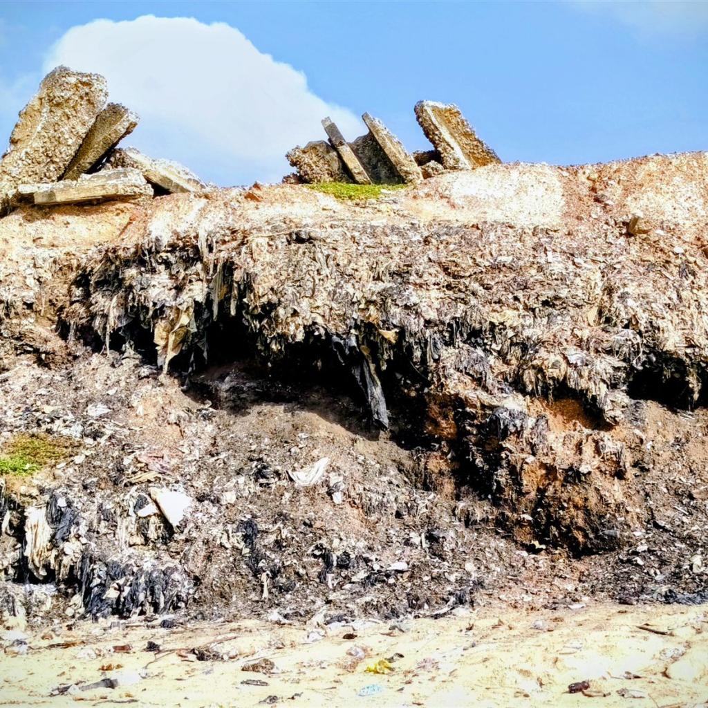 Wir liefen am Wasser entlang. Der Sand unter unseren Füßen fühlte sich seltsam an – dunkel, fast schwarz und ungewöhnlich fest. Vor uns, dort wo das Land eigentlich sanft in den Ozean übergehen sollte, erhob sich plötzlich eine Wand. Es war eine schroffe Abbruchkante, die sich wie eine offene, hässliche Narbe kilometerweit durch die Küstenlinie zog. Stellenweise ragte sie zwei bis drei Meter hoch auf.