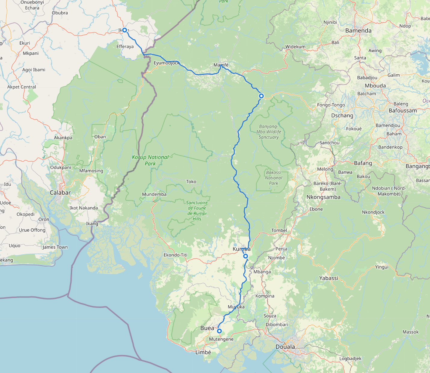 Unsere Wahl: Die N6-N8-Route Wir haben uns für die Strecke Ekok über Mamfe nach Kumba und Buea entschieden. Aber das geht zur Zeit nur im Militärkonvoi. Die Strategie: Ein Militärkonvoi, drei Fahrzeuge, Funkgeräte, gegenseitige Absicherung. Das Learning daraus: Ganz egal, welche Route du wählst, ein Risiko ist immer dabei. Wer sich eingehend mit dieser Region auseinandersetzt, findet sehr schnell große Warnhinweise, dieses Gebiet nicht zu betreten.