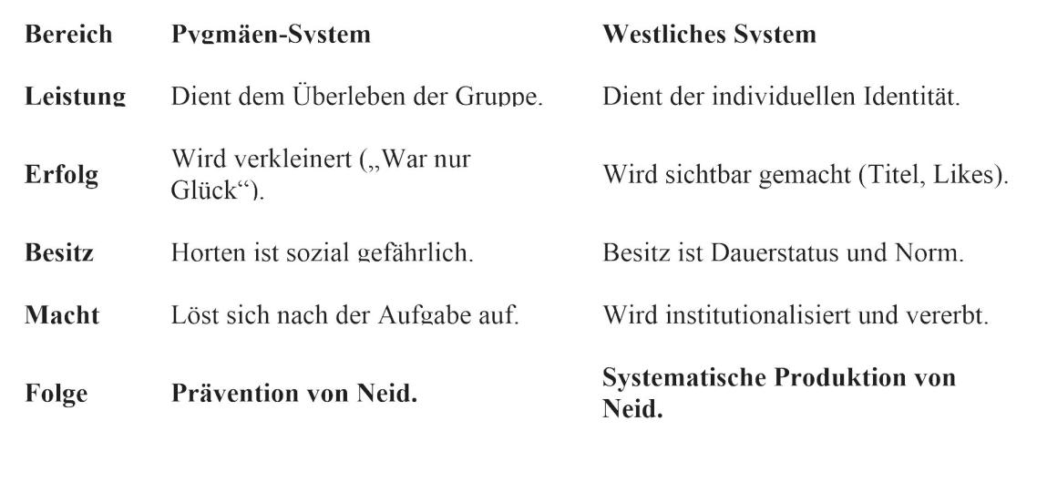 Wir haben ein System gebaut, das Neid als Wettbewerbsmotor braucht. Das System der Pygmäen hingegen war darauf ausgelegt, Neid unnötig zu machen. Es war nicht romantisch, sondern pragmatisch – in kleinen Gruppen bei hohem Risiko ist Abhängigkeit die beste Versicherung.