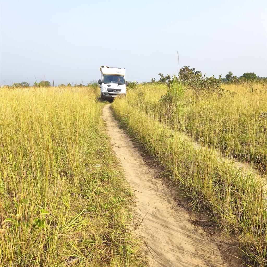Nachdem alle Besorgungen erledigt waren, hielten wir direkt auf das Camp Abio zu. Nach etwa 190 Kilometern zweigte die gute Straße in eine Piste ab, die definitiv nicht für jedes Fahrzeug geeignet ist. Hier war volle Konzentration gefragt: Die Bodenfreiheit erforderte ein wachsames Auge und die sandigen Passagen viel Feingefühl bei der Gasannahme. Für die 19 Kilometer „Pisten-Fingerspitzengefühl“ benötigten wir etwa 45 Minuten, bis wir schließlich wohlbehalten im Camp ankamen, das sich uns Overlandern von seiner einladenden Seite präsentierte. Den Nachmittag verbrachten wir im Austausch mit anderen Reisenden, die Astrids Fahrzeug bewunderten, bevor uns eine kühle Nacht tiefen Schlaf und Träume von den Gorillas bescherte.