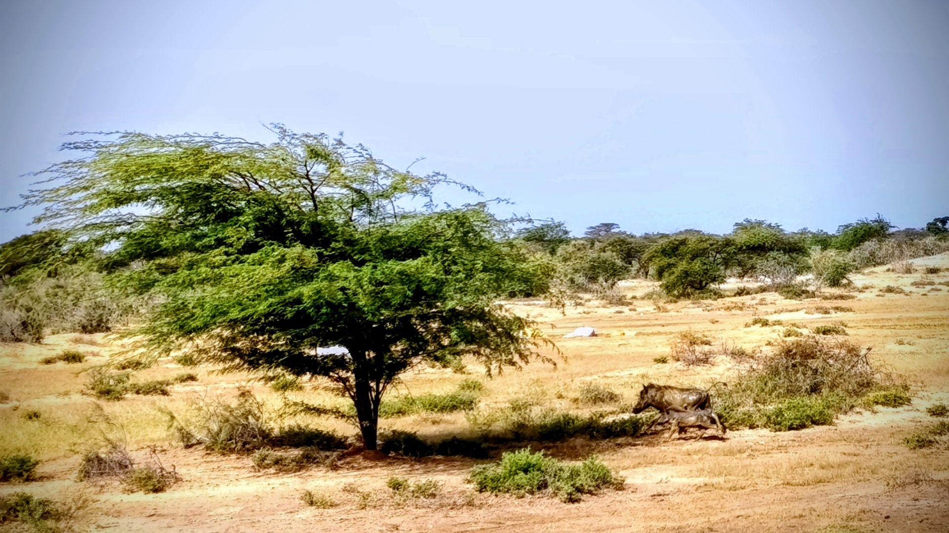 Während wir uns an diesem friedlichen Bild erfreuten, bekam Astrid plötzlich einen Schreck. Ein Tier überquerte gemächlich die sandige Piste vor ihr. Zuerst dachte sie an eine große Echse – doch das Wesen bewegte sich anders, schwerer, mit einem wippenden Schwanz.